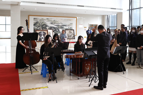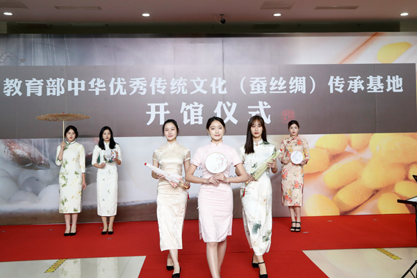 仪式在蚕花艺术团演奏乐曲《蚕桑舞》和校丝绸文化旗袍大使走秀表演《丝韵江南》中拉开帷幕。